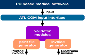 The input will be supplied through a programmatic interface. Thereafter the data is transformed into a standards-compliant XML invoice stream that is sent to the intermediate. Alternatively, one can force the invoice module to send the input to a print engine producing the appropriate invoice on paper. As a side effect of the encapsulation the developers of the main software do not need to care, format nor implement the XML invoice standard. To ensure standards-compliance, an invoice module leverages validation services provided by the companion validator modules.